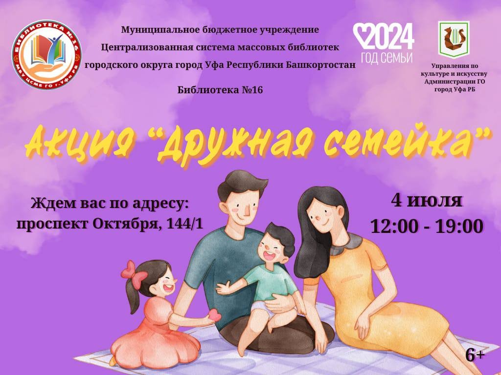 Библиотека №16 (г. Уфа, Проспект Октября, 144/1) 4 июля с 12:00 – 19:00 приглашает жителей и гостей столицы принять участие в акции «Дружная семейка».