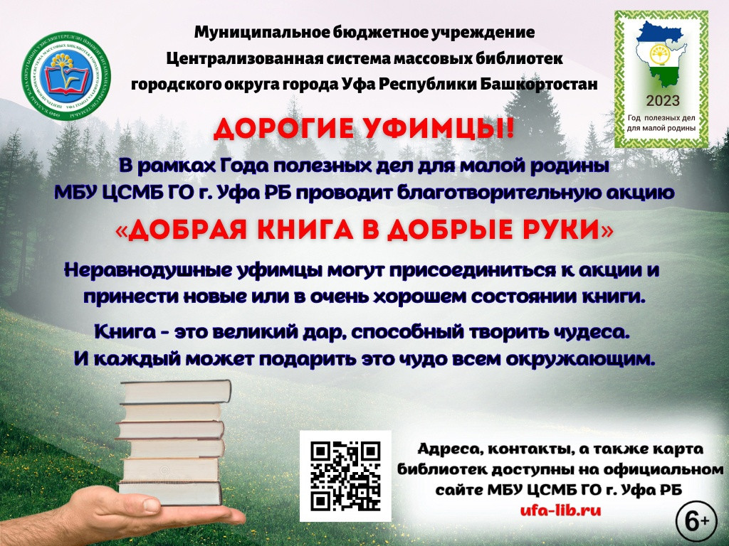 В рамках Года полезных дел для малой родины МБУ Централизованная система массовых библиотек ГО г. Уфа РБ проводит благотворительную акцию «Добрая книга в добрые руки».