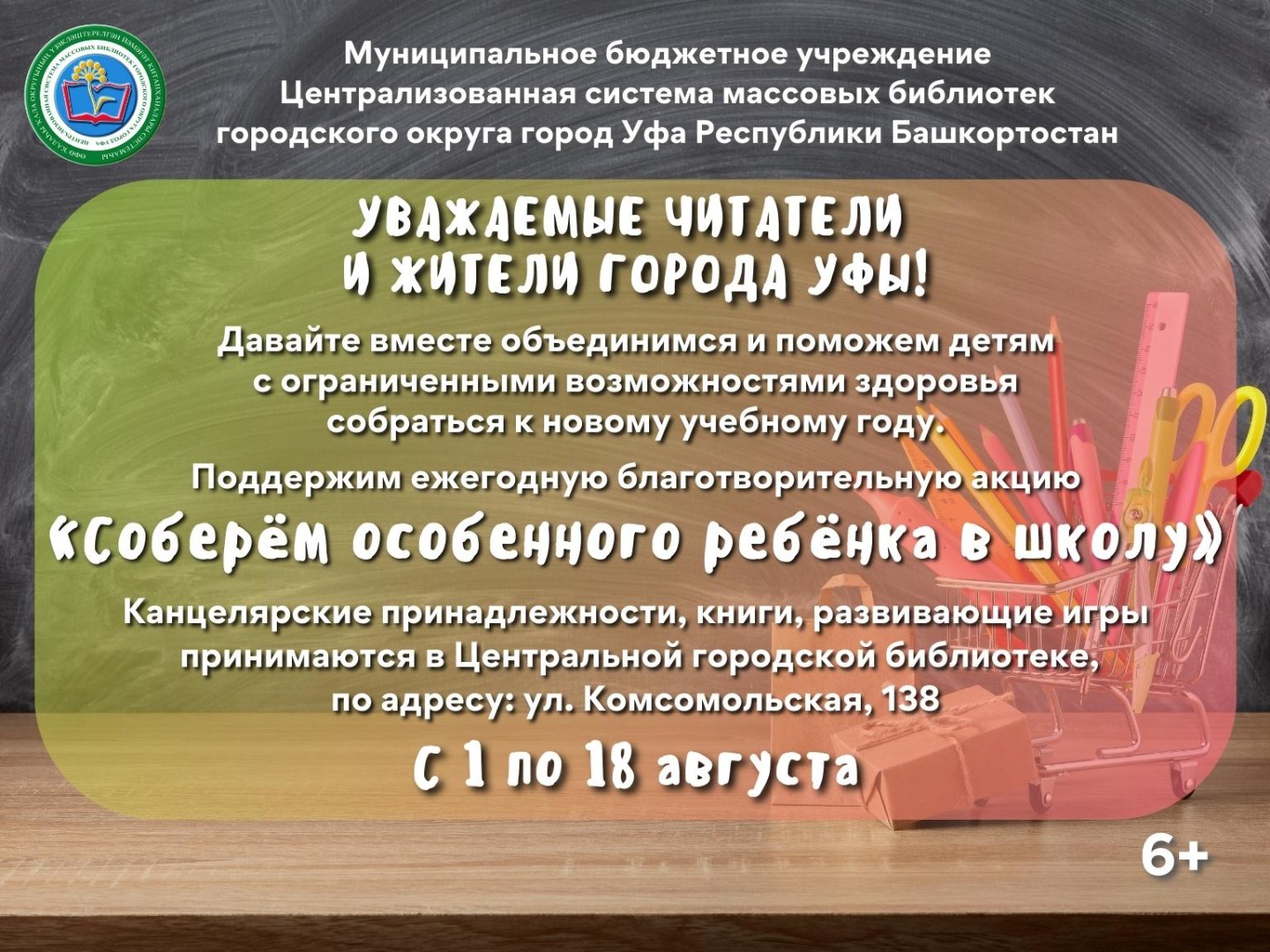 Совсем скоро во всех школах прозвенит школьный звонок. В преддверии праздника, Централизованная система массовых библиотек городского округа город Уфа Республики Башкортостан приглашает читателей и жителей города присоединиться и поддержать ежегодную благотворительную акцию «Соберём особенного ребёнка в школу».