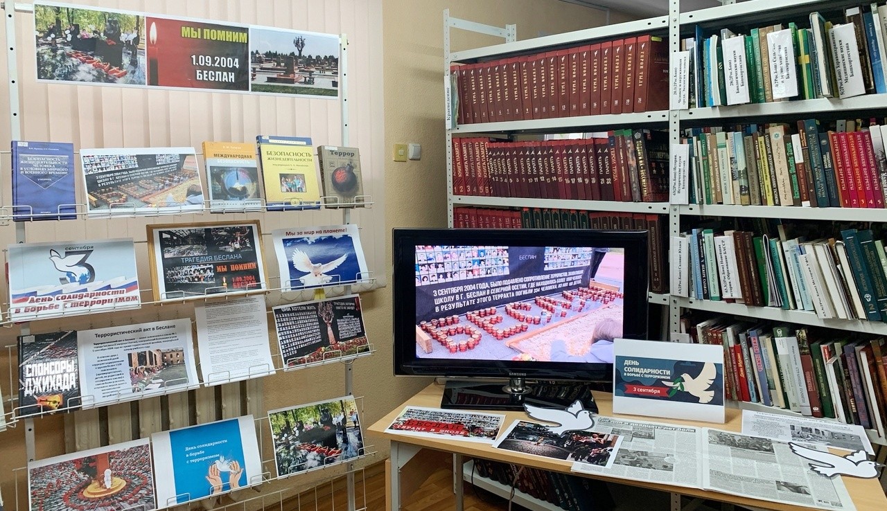 Внимание участников мероприятия было обращено на книжную выставку «Мы помним тебя, Беслан», по которой был проведен обзор.