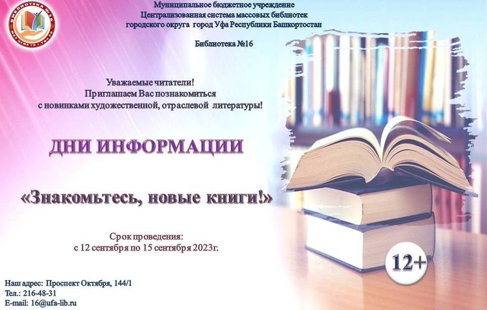 С 12 сентября по 15 сентября 2023 года в библиотеке №16 пройдет День информации «Знакомьтесь, новые книги».