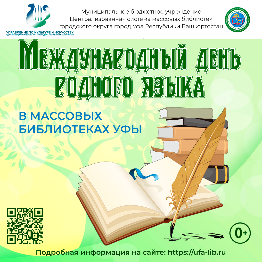 — 21 февраля открытых просмотров литературы выставок «Родной язык! Как ты прекрасен!» в Библиотеке №15 (г. Уфа, ул. Ю. Гагарина, 37/1), «Язык – основа дружбы и согласия» в Центральной городской библиотеке (г. Уфа, ул. Комсомольская, 138), «Золотые зерна родной речи» в Модельной библиотеке №26 (г. Уфа, ул. Сипайловская, 14/1), «Родной язык – богатое наследство» в Библиотеке №49 (г. Уфа, ул. Б. Хмельницкого, 92).