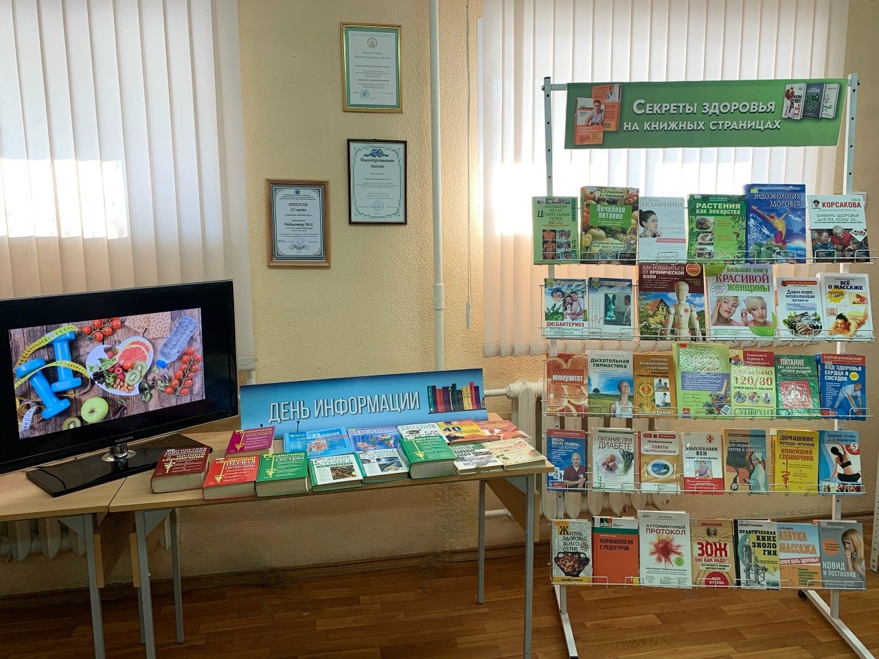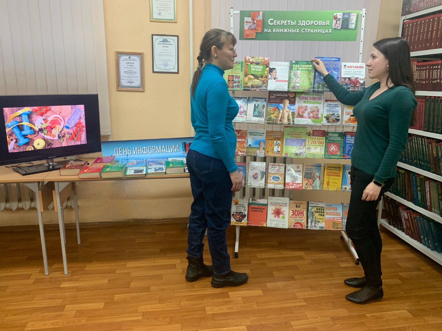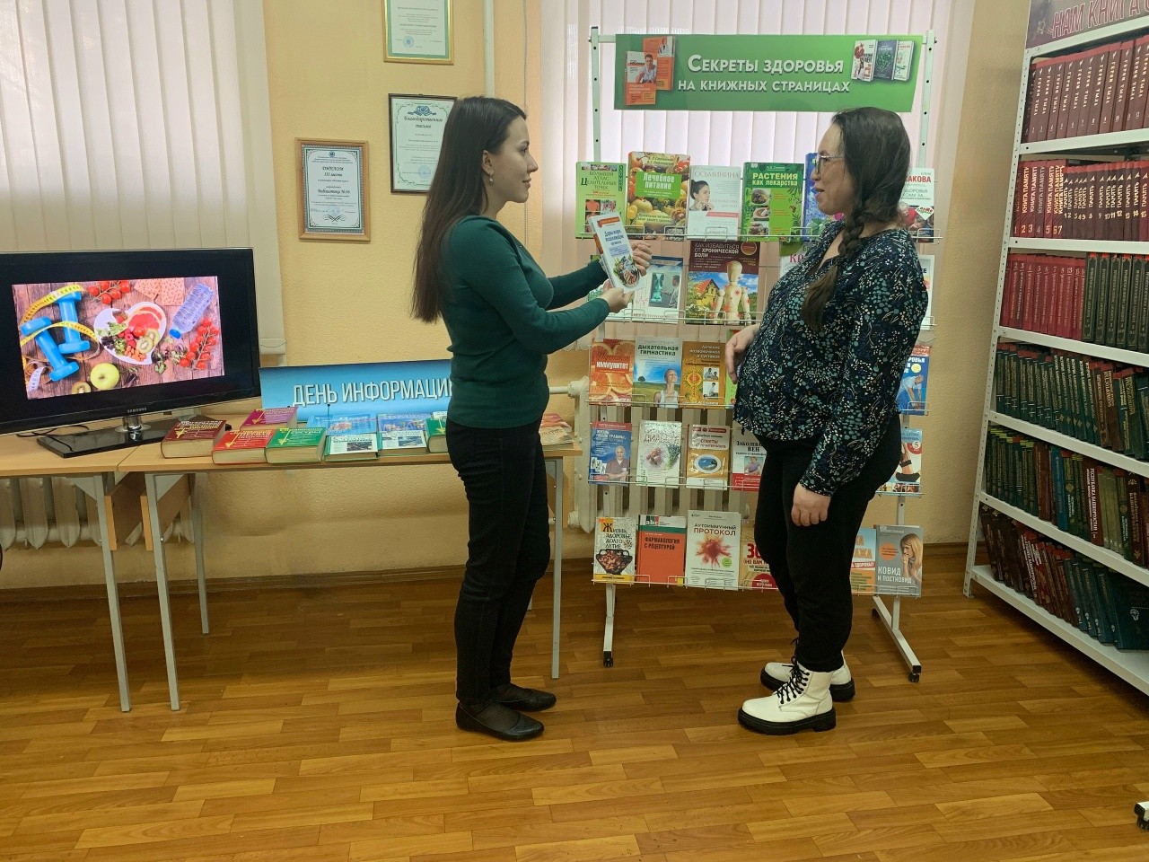Для читателей был проведен обзор книжной выставки «Секреты здоровья на книжных страницах», посвященной основным слагаемым здоровья и активного долголетия: физической активности, сбалансированному питанию, методикам и системам оздоровления.
