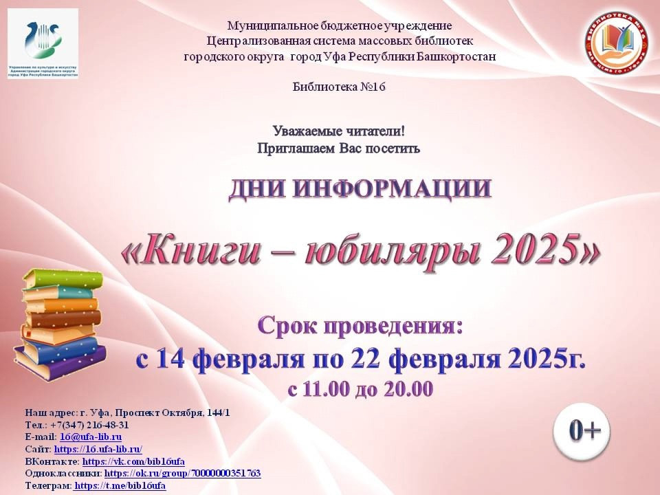 С 14 февраля по 22 февраля 2025 года в библиотеке №16 пройдут Дни информации «Книги-юбиляры 2025».