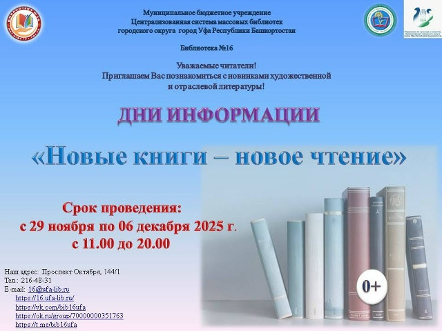 С 29 ноября по 06 декабря 2025 года в библиотеке №16 пройдут Дни информации «Новые книги - новое чтение».