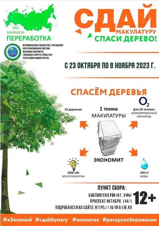 С 23 октября по 8 ноября 2023 года в Республике Башкортостан проходит Экомарафон ПЕРЕРАБОТКА «Сдай макулатуру – спаси дерево!». Централизованная система массовых библиотек г. Уфы присоединяется к акции. Все желающие могут принести макулатуру по адресу: г. Уфа, Проспект Октября 144/1.