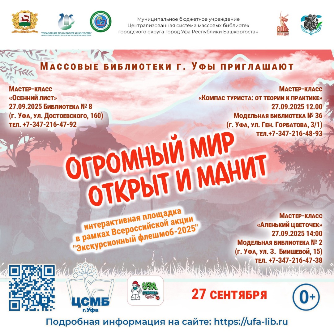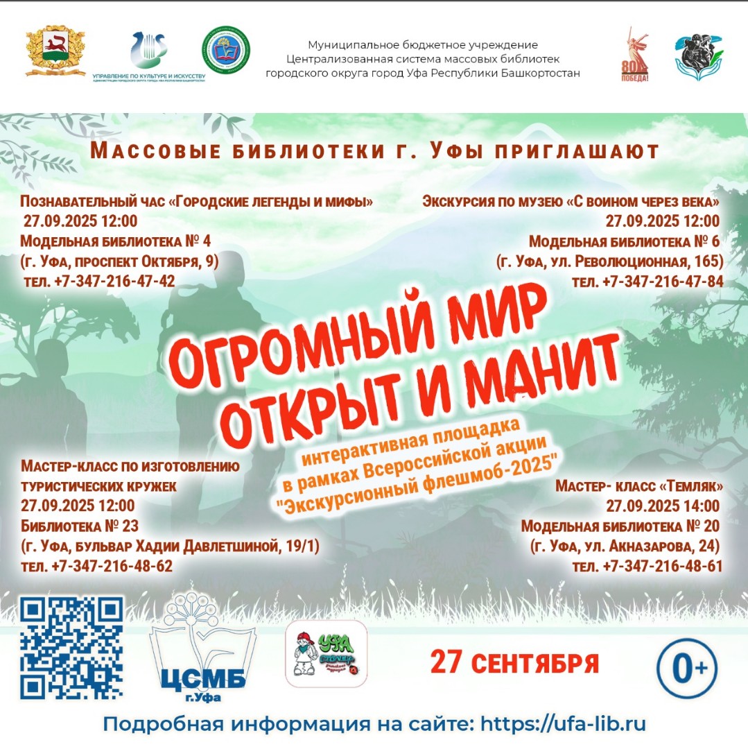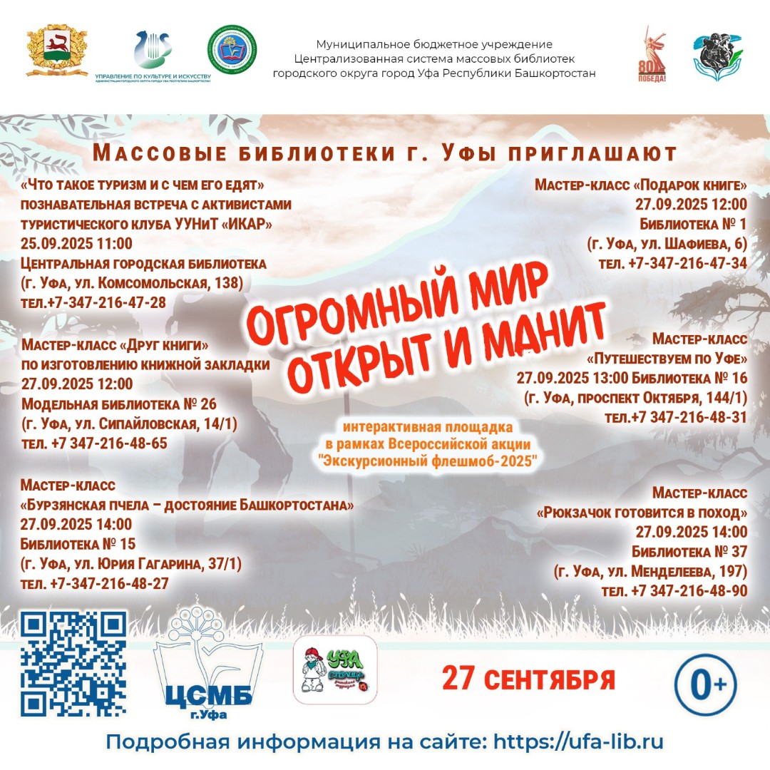 27 сентября 2025 года в 12:00 массовые библиотеки Уфы приглашают вас стать частью грандиозного события — ежегодной Всероссийской акции «Экскурсионный флешмоб-2025»!