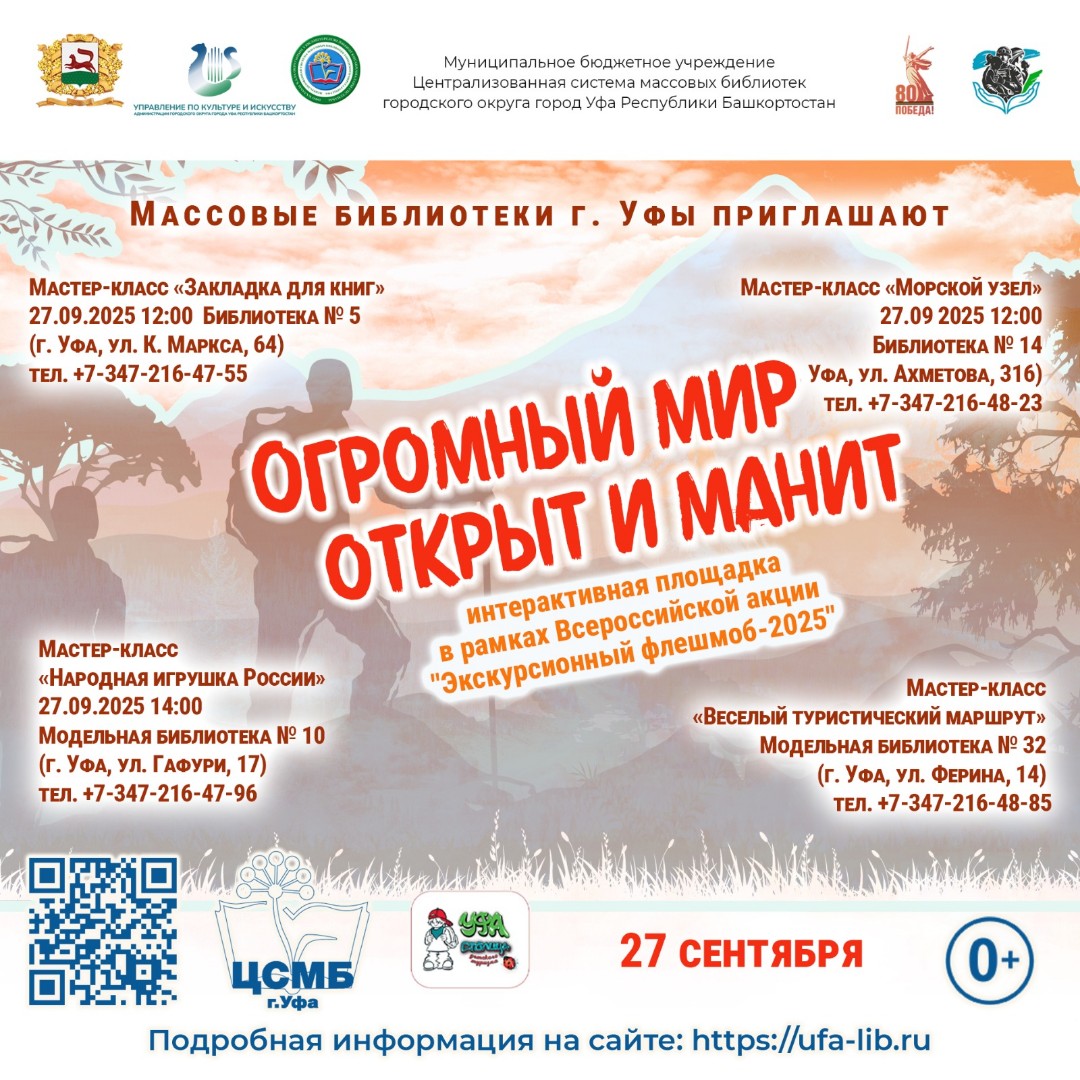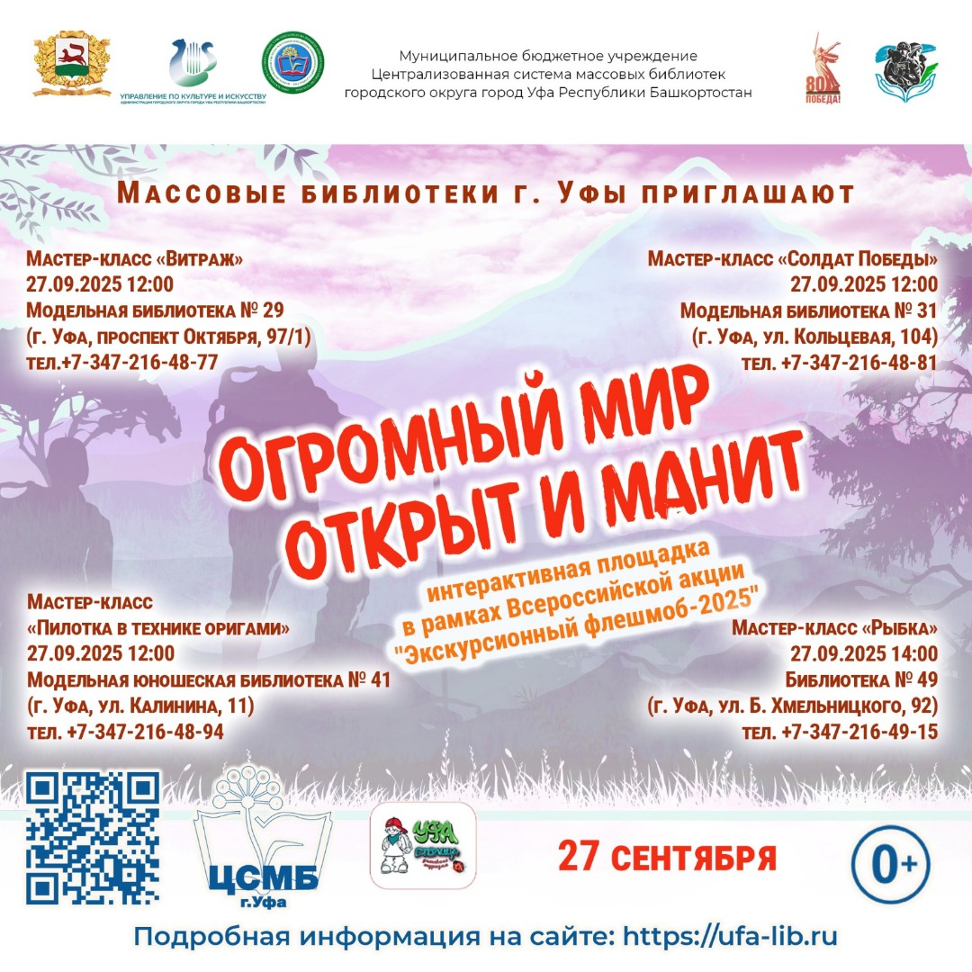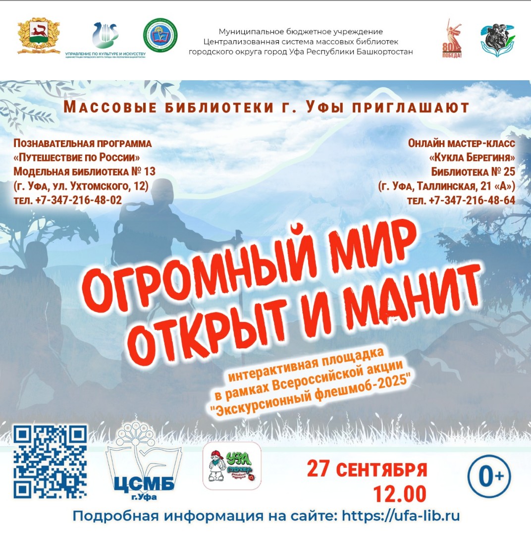27 сентября 2025 года в 12:00 массовые библиотеки Уфы приглашают вас стать частью грандиозного события — ежегодной Всероссийской акции «Экскурсионный флешмоб-2025»!