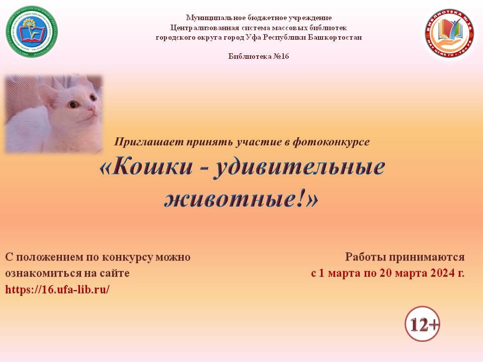 Библиотека № 16 МБУ Централизованной системы массовых библиотек ГО г. Уфа РБ запускает фотоконкурс «Кошки – удивительные животные!», который пройдет с 01 марта по 02 апреля 2024 года. Его участником может стать любой желающий от 12 лет и старше.
