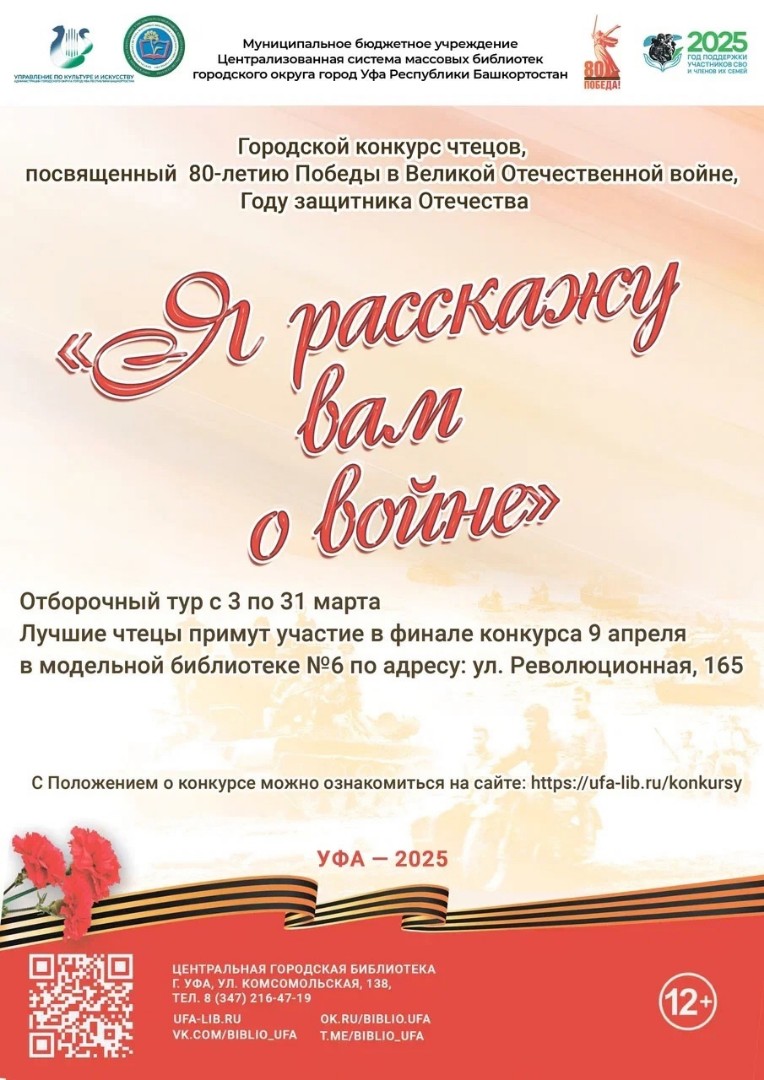 В апреле 2025 года в Центральной городской библиотеке г. Уфы состоится Городской конкурс чтецов «Я расскажу вам о войне», посвященный празднованию 80-летия Победы в Великой Отечественной войне.