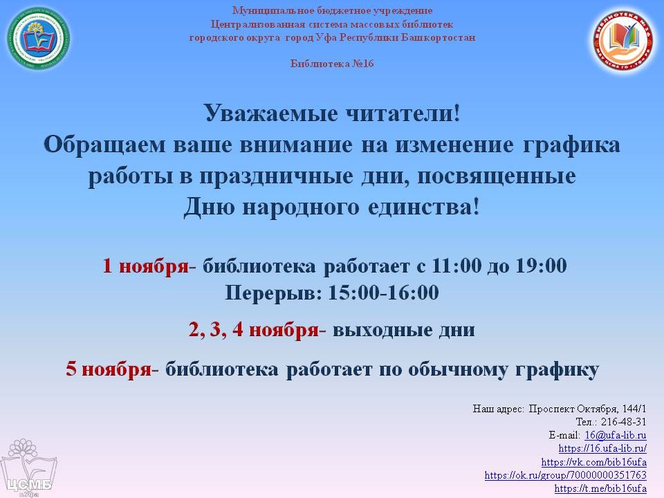 1 ноября — библиотека работает с 11:00 до 19:00.