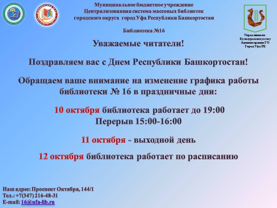 Обращаем ваше внимание на изменение графика работы библиотеки в праздничные дни, посвященные Дню Республики Башкортостан