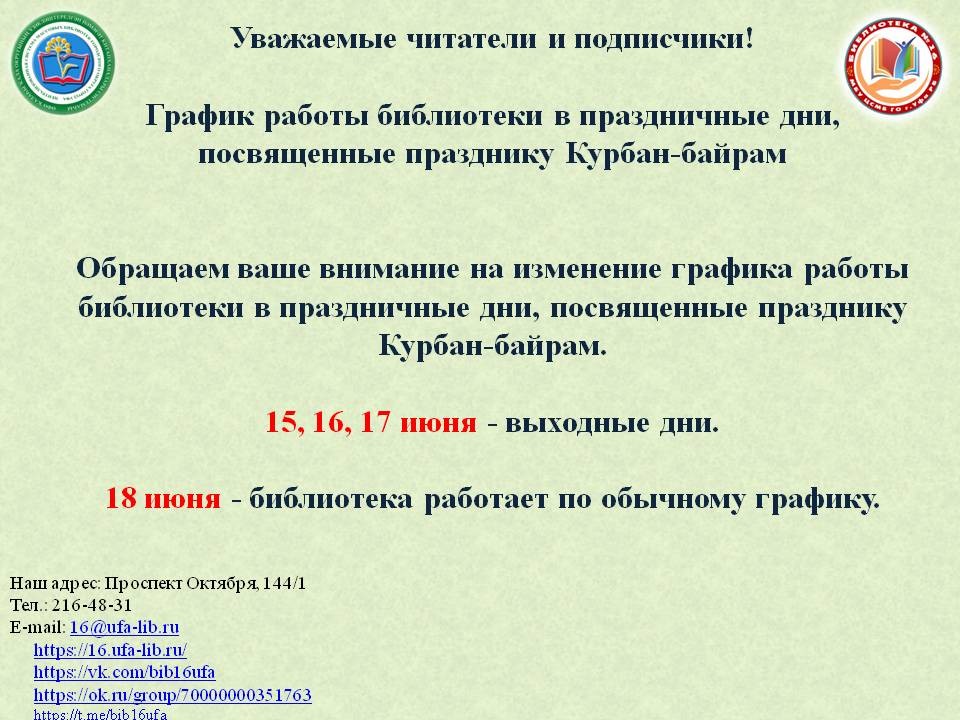Обращаем ваше внимание на изменение графика работы библиотеки в праздничные дни, посвященные празднику Курбан-байрам.15, 16, 17 июня - выходные дни.18 июня - библиотека работает по обычному графику.