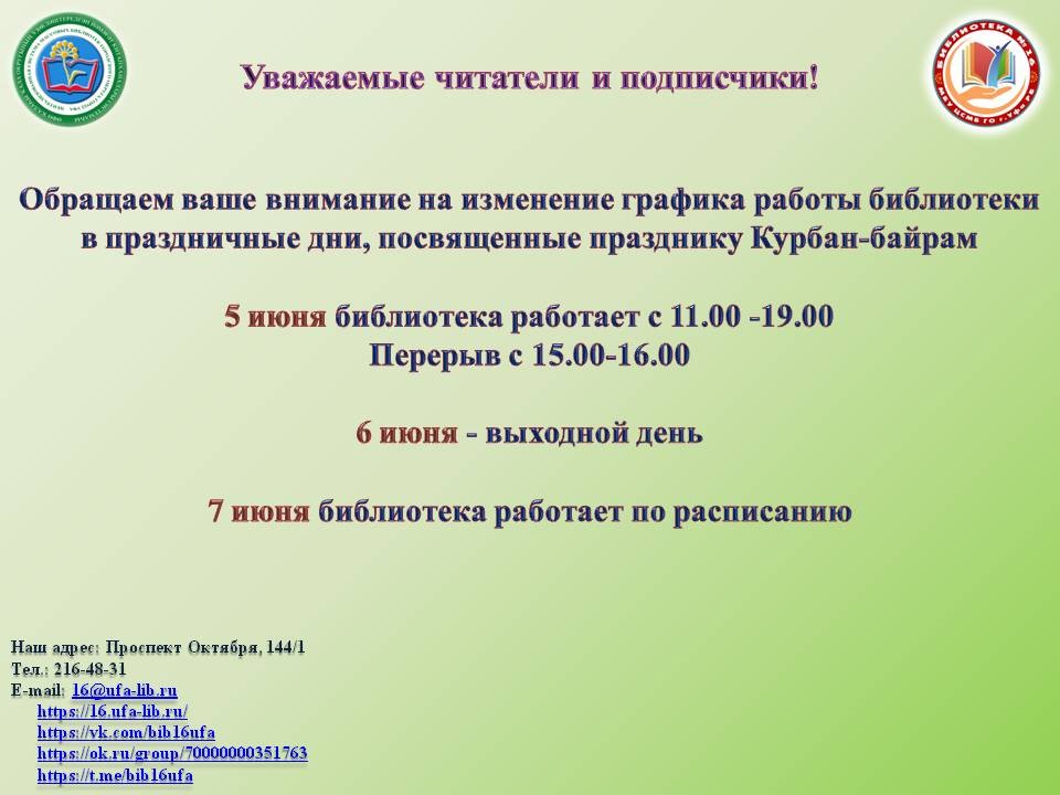 5 июня библиотека работает с 11.00 -19.00
