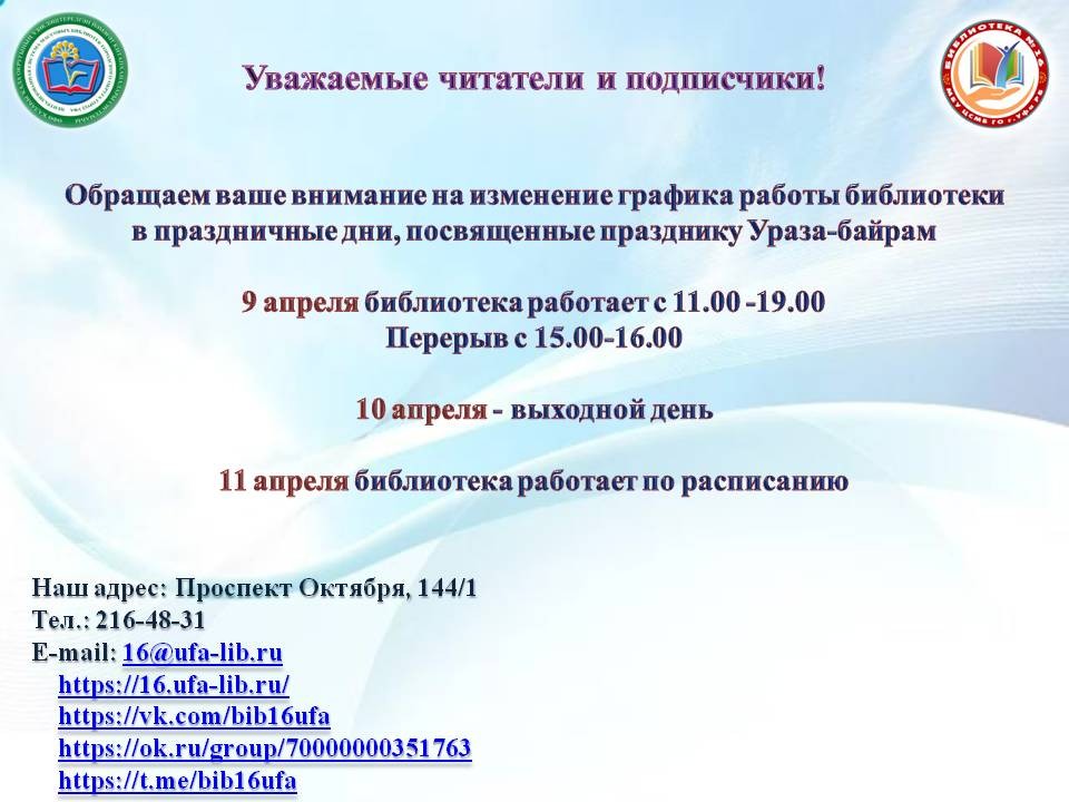 9 апреля - библиотека работает с 11:00 до 19:00 часов.
