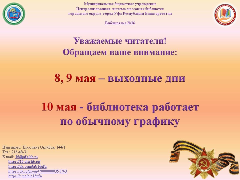 Уважаемые читатели!Обращаем ваше внимание:8, 9 мая – выходные дни10 мая - библиотека работает по обычному графику