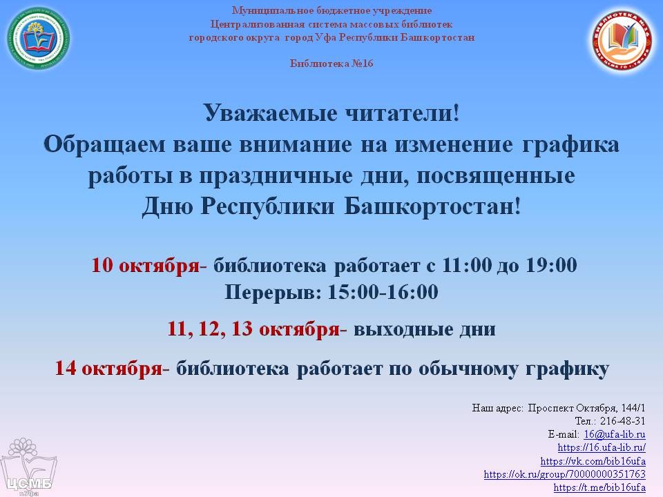 Обращаем ваше внимание на изменение графика работы библиотеки в праздничные дни, посвященные Дню Республики Башкортостан