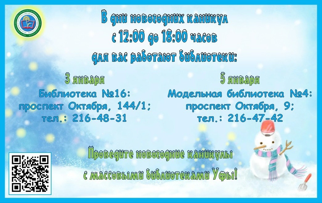 Уважаемые читатели и подписчики!Обращаем ваше внимание на график работы массовых библиотек Уфы в дни Новогодних каникул.Приходите, мы всегда вам рады!