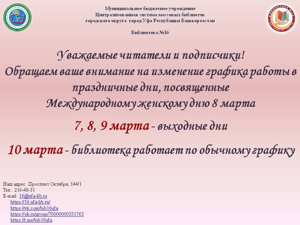График работы в праздничные дни, посвященные Международному женскому дню 8 марта