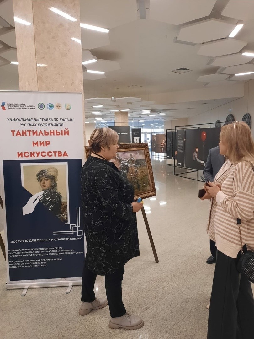 Сотрудники модельных библиотек № 29, 31 и модельной юношеской библиотеки № 41 МБУ Централизованной системы массовых библиотек ГО г. Уфа РБ представили 5 тактильных картин, доступных для людей с ограничением здоровья по зрению. Библиотекари знакомили участников форума с картинами русских художников, выполненных в 3D технике и специальным оборудованием, предназначенным для аудиовосприятия информации о картинах.
