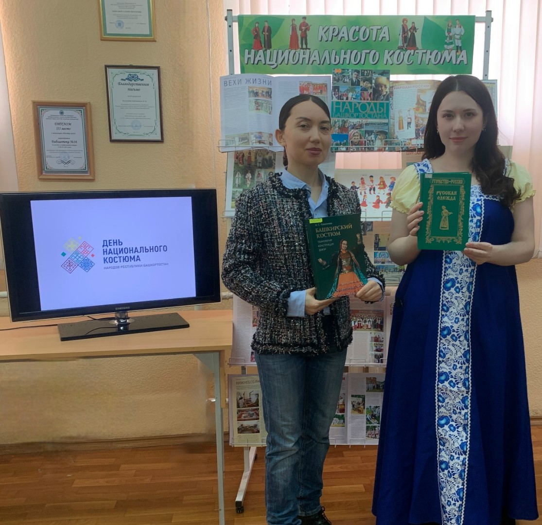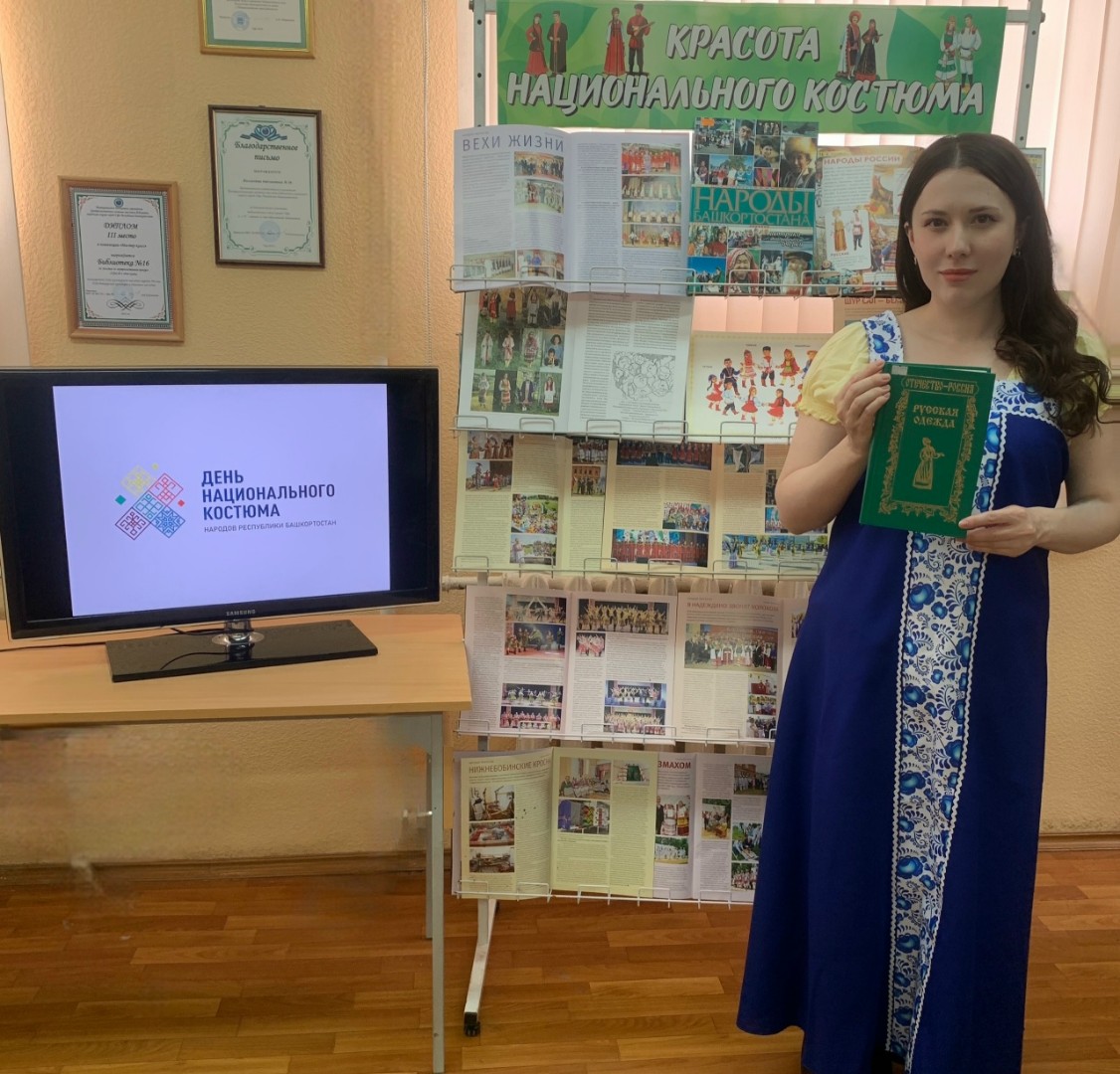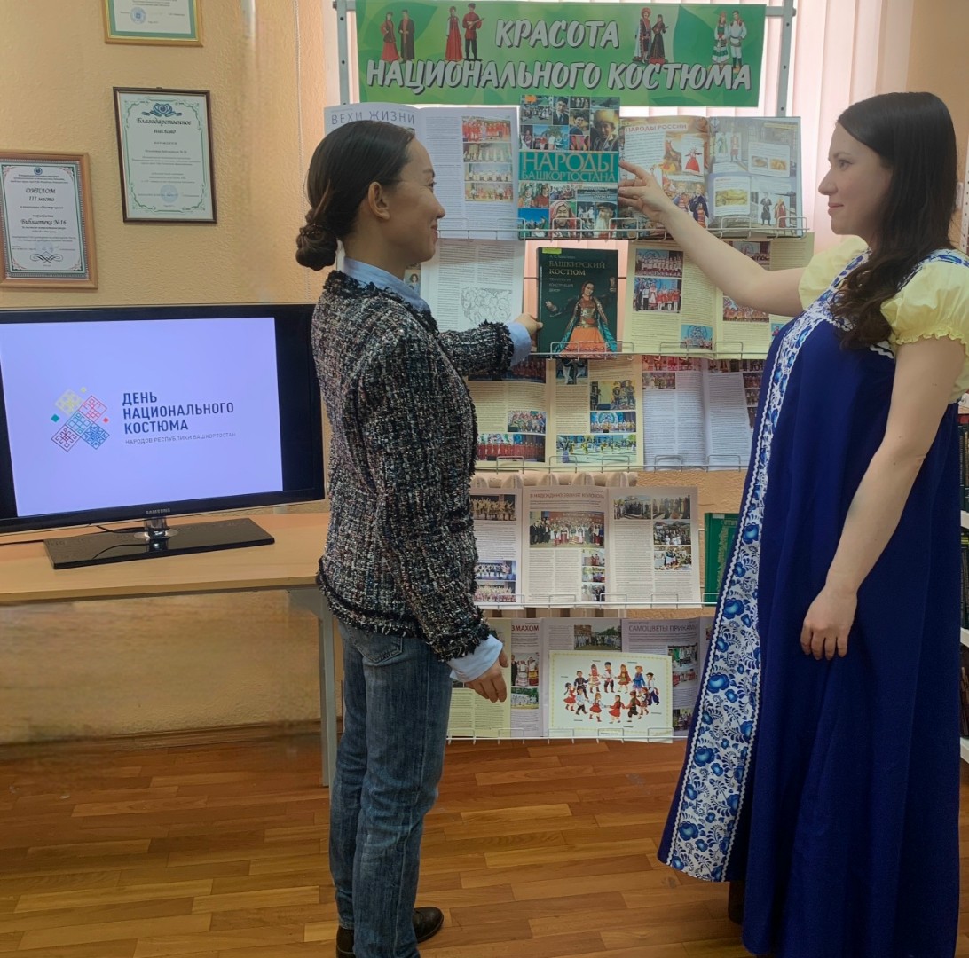 Библиотекарь провела обзор книжной выставки и рассказала присутствующим об истории Дня национального костюма, о традиционных нарядах народов, проживающих на территории Республики Башкортостан, и отметила, что необходимо бережно хранить бесценный опыт, традиции и ценности, передаваемые из поколения в поколение.