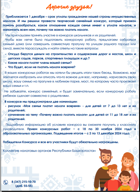 Налоговые органы Республики Башкортостан проводят творческий семейный конкурс «Моя семья платит налоги вовремя».