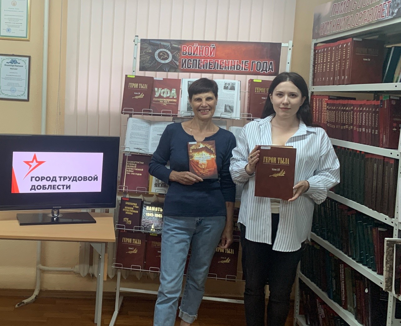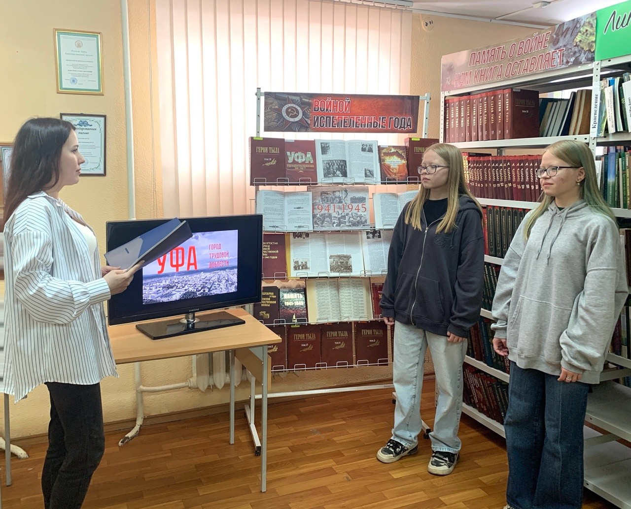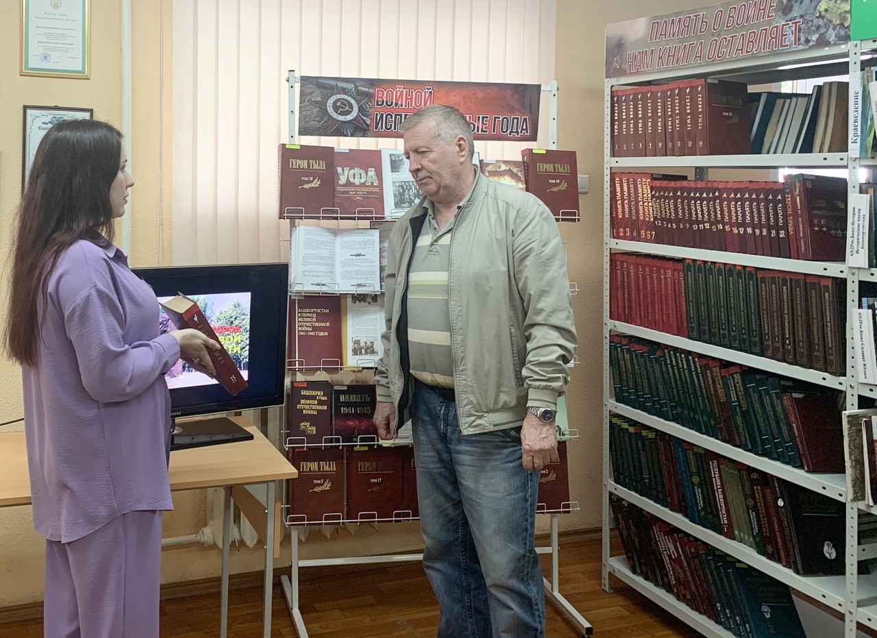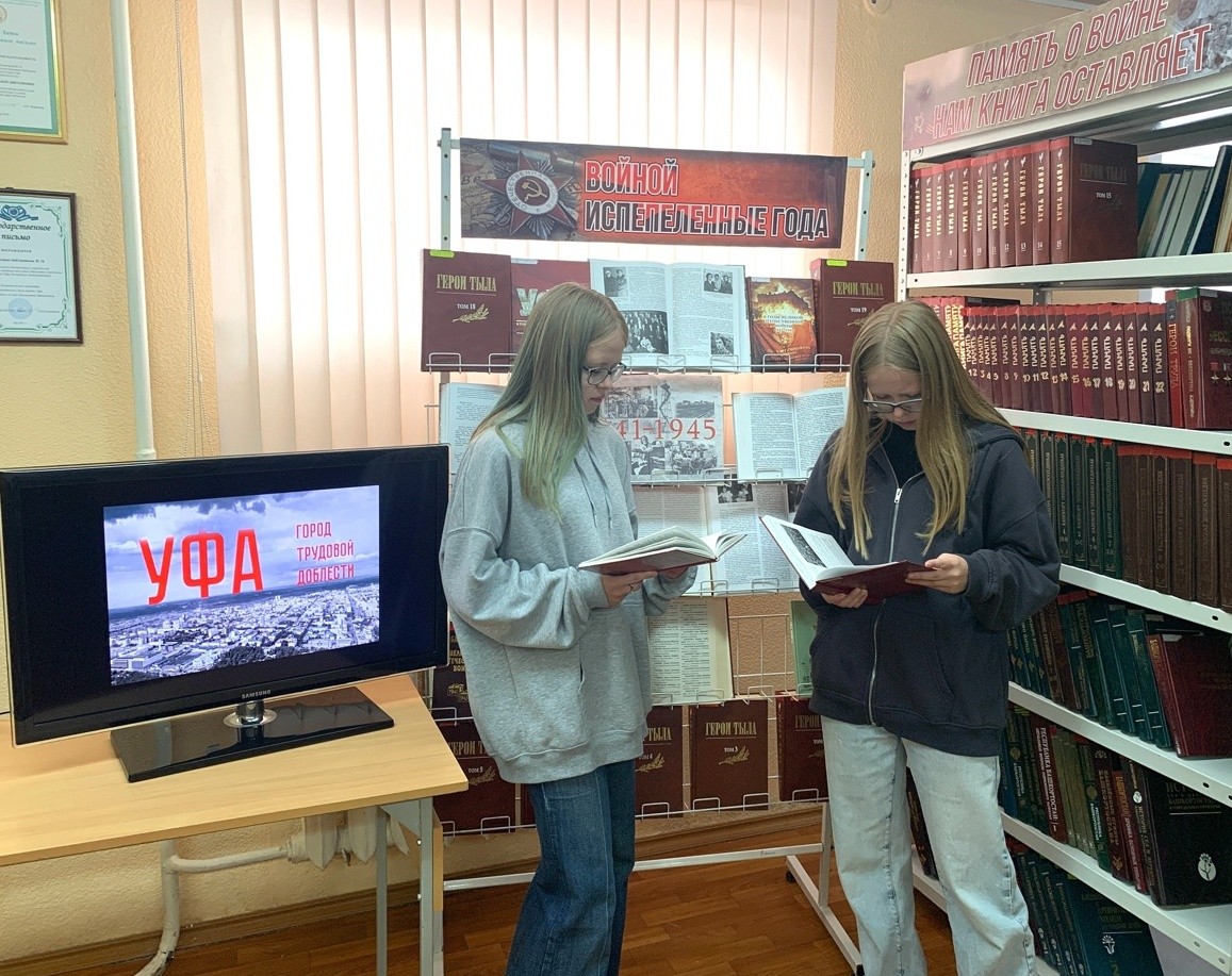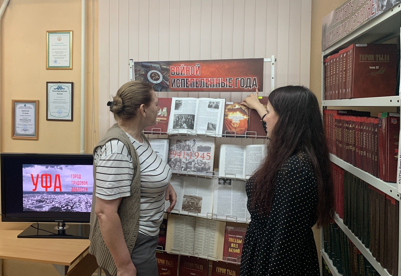 Выступление сопровождалось показом видеоролика «Уфа – город трудовой доблести». В завершение был проведен обзор книжной выставки «Войной испепеленные года».
