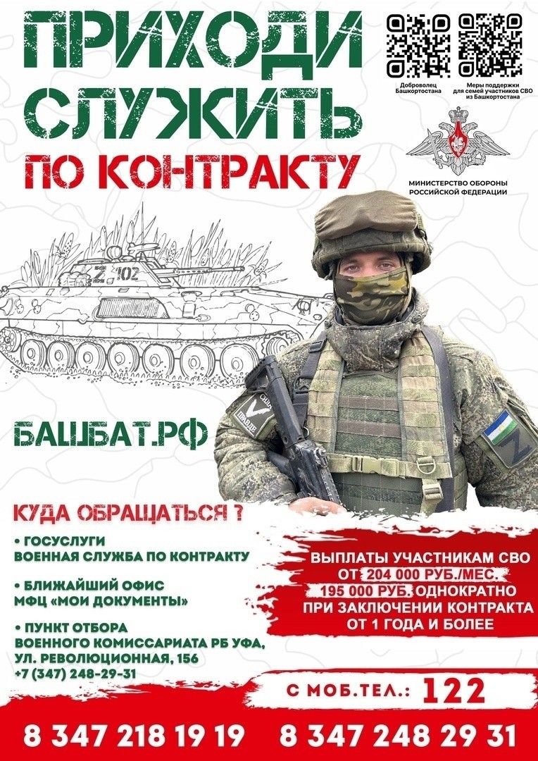 Военный комиссариат по месту учета либо на Пункт отбора на военную службу по контракту, которая находится в г. Уфа, ул. Революционная, 156. Тел.: 8 (347) 248-29-31, 248-18-63.