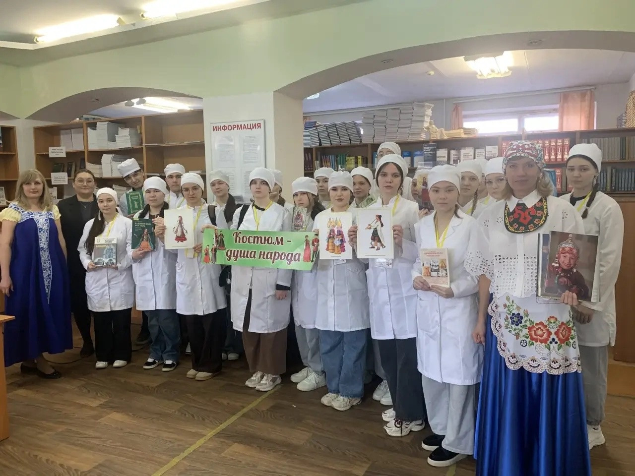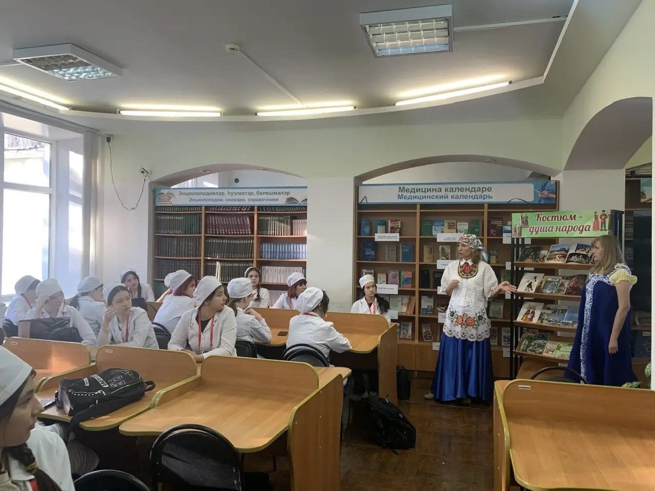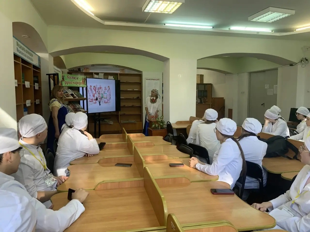 2 апреля 2026 года работники двух массовых библиотек Октябрьского района г.Уфы: библиотеки № 16 и модельной библиотеки № 35 посетили библиотеку ГАПОУ РБ «Уфимский медицинский колледж» с целью встретиться со студентами, обучающимися в нем, проведя литературное путешествие «Костюм – душа народа».