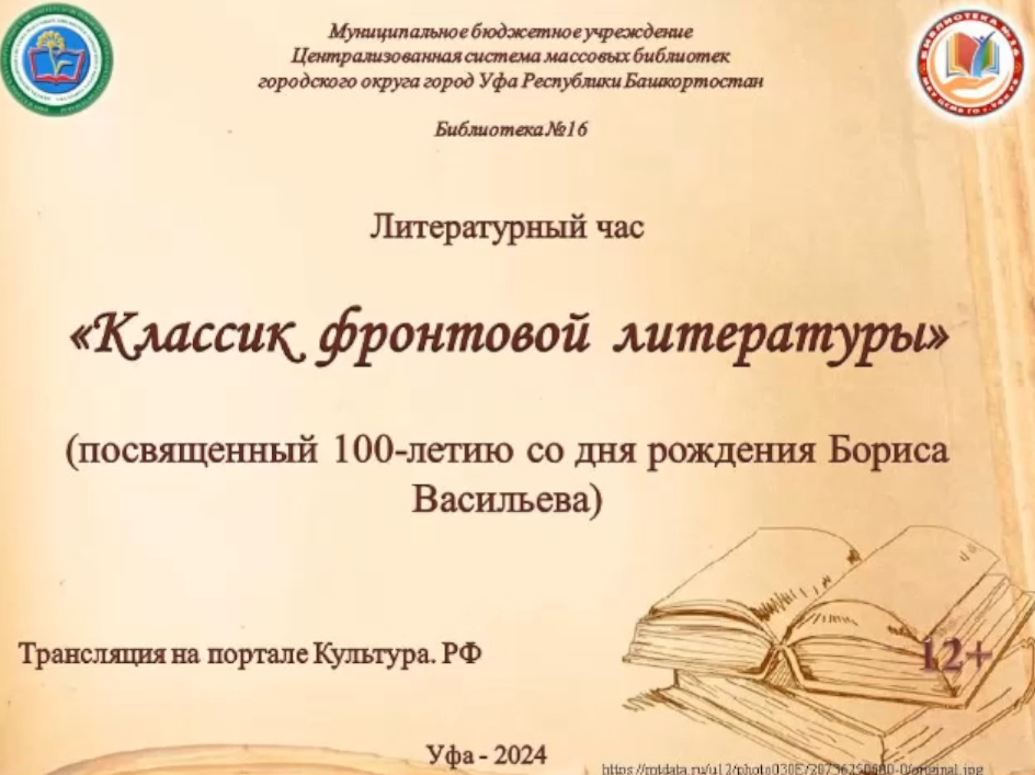 100-летию со дня рождения выдающегося писателя библиотека посвящает литературный час «Классик фронтовой литературы». Прямая трансляция пройдет на официальном сайте Культура.РФ.