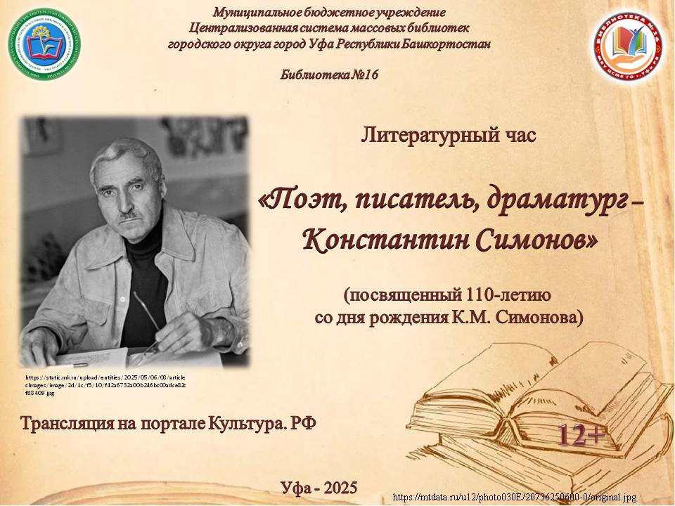 110-летию со дня рождения выдающегося писателя библиотека посвящает литературный час «Поэт, писатель, драматург – Константин Симонов». Прямая трансляция пройдет на официальном сайте Культура.РФ.