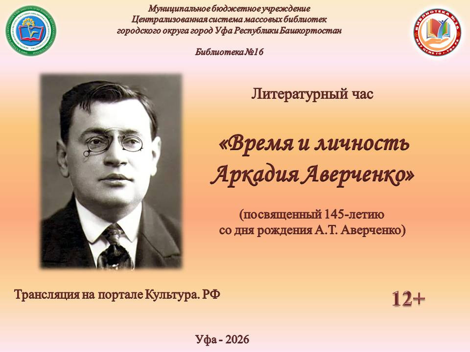 145-летию со дня рождения выдающегося писателя библиотека посвящает литературный час «Время и личность Аркадия Аверченко». Прямая трансляция пройдет на официальном сайте Культура.РФ.