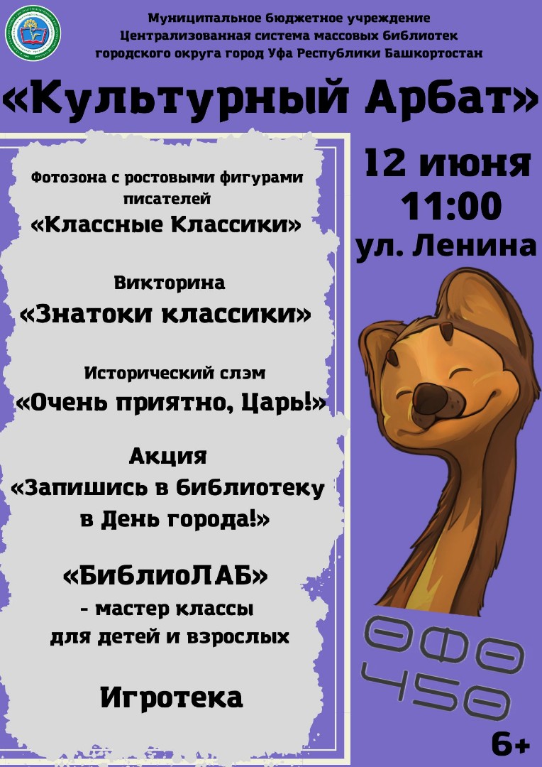 12 июня, в рамках празднования Дня России, 269-летия со дня рождения Салавата Юлаева и 449-летия основания города Уфа на улице Ленина пройдет масштабный городской фестиваль «Уфа, гуляем!». Централизованная система массовых библиотек г. Уфы примет участие на площадке «Культурный Арбат».