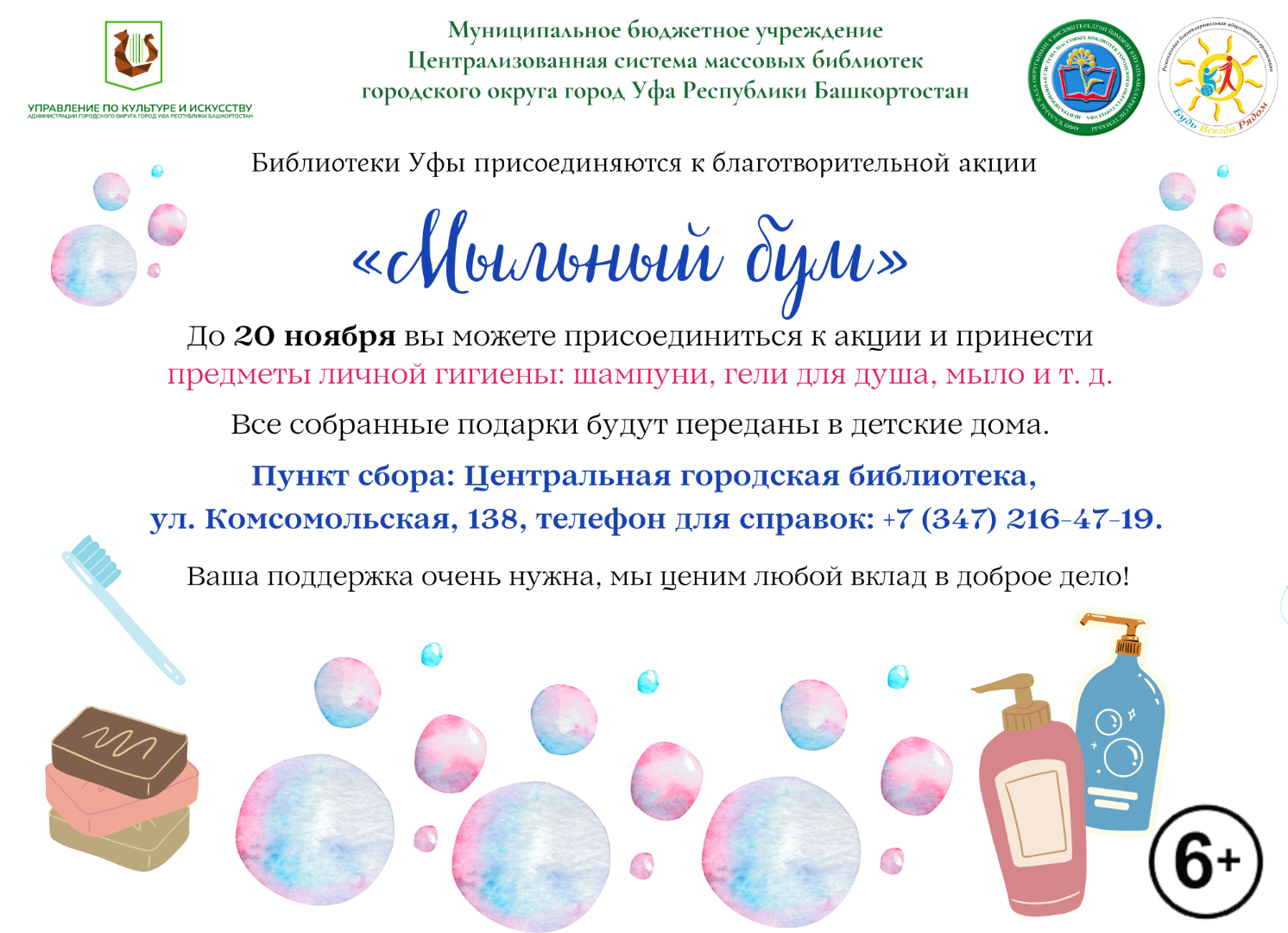 Все неравнодушные могут присоединиться к акции до 20 ноября и принести предметы личной гигиены: шампуни, гели для душа, мыло и т.д. в Центральную городскую библиотеку г. Уфы, по адресу ул. Комсомольская, 138.