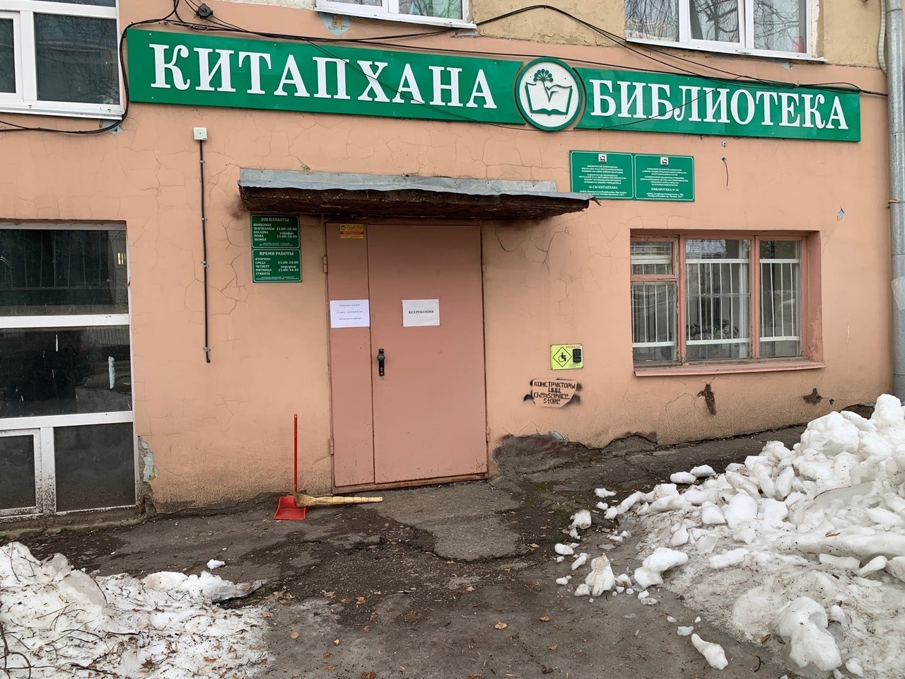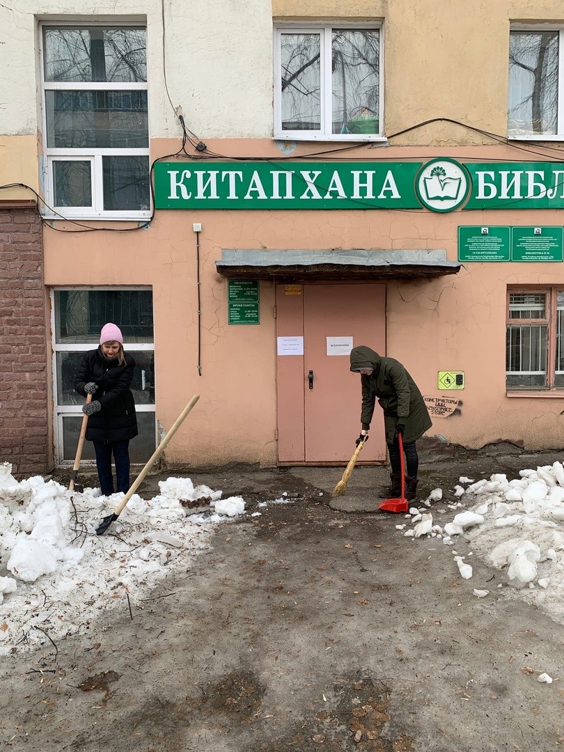 Сотрудники библиотеки вышли на уборку входной группы здания и прилегающей территории от мусора.