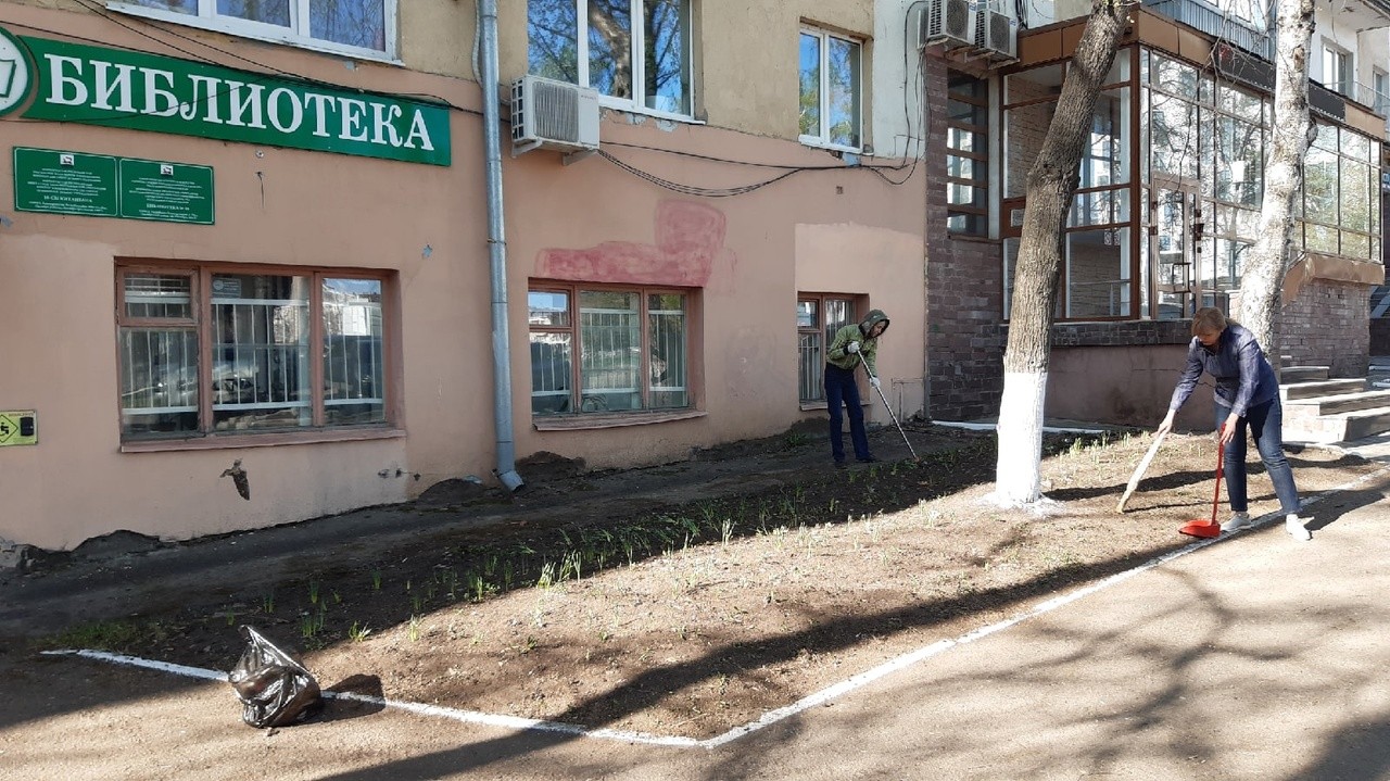 Сотрудники библиотеки вышли на уборку входной группы здания и прилегающей территории от мусора.