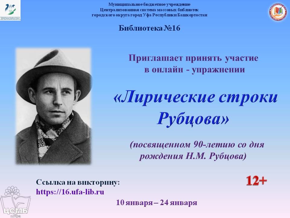 Библиотека № 16 МБУ Централизованной системы массовых библиотек ГО г. Уфа РБ проводит онлайн-упражнение «Лирические строки Рубцова», посвященное 90-летию со дня рождения Н.М. Рубцова.