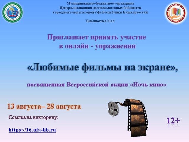 Библиотека № 16 МБУ Централизованной системы массовых библиотек ГО г. Уфа РБ проводит онлайн-упражнение «Любимые фильмы на экране», посвященное Всероссийской акции «Ночь кино».
