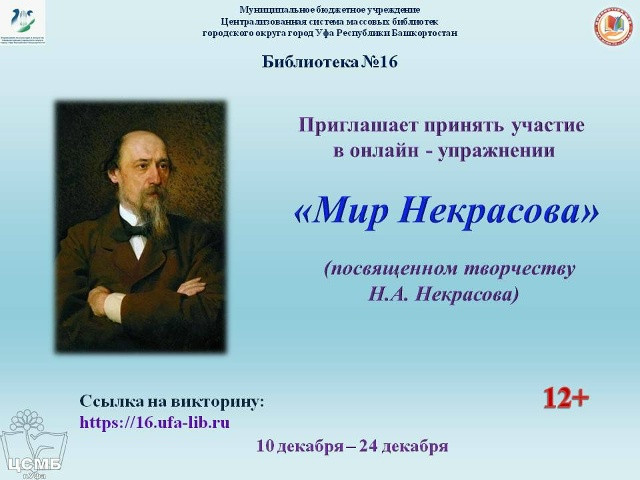 Библиотека № 16 МБУ Централизованной системы массовых библиотек ГО г. Уфа РБ проводит онлайн-упражнение «Мир Некрасова», посвященное творчеству Н.А. Некрасова.