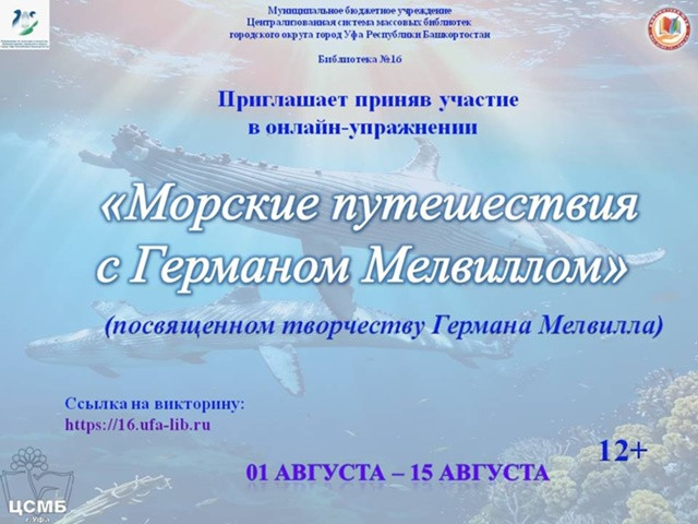 Библиотека № 16 МБУ Централизованной системы массовых библиотек ГО г. Уфа РБ проводит онлайн-упражнение «Морские путешествия с Германом Мелвиллом», посвященное творчеству Германа Мелвилла.