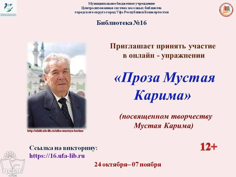 Библиотека № 16 МБУ Централизованной системы массовых библиотек ГО г. Уфа РБ проводит онлайн-упражнение «Проза Мустая Карима», посвященное творчеству Мустая Карима.