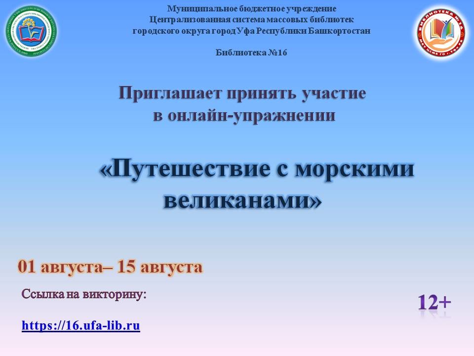 Библиотека № 16 МБУ Централизованной системы массовых библиотек ГО г. Уфа РБ проводит онлайн-упражнение «Путешествие с морскими великанами», посвященное самому известному произведению Германа Мелвилла «Моби Дик, или Белый кит».