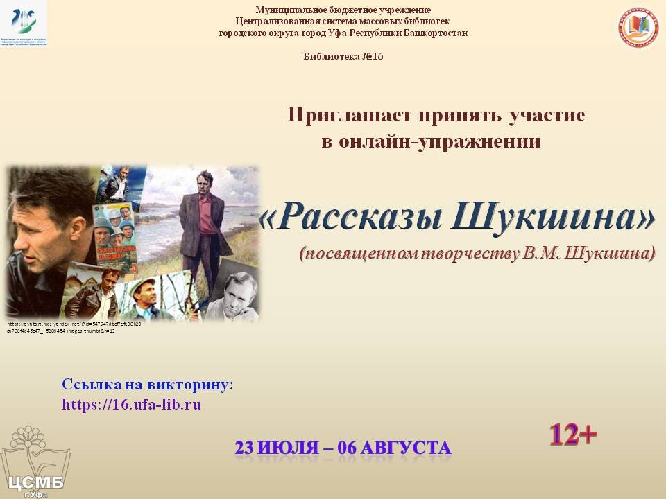 Библиотека № 16 МБУ Централизованной системы массовых библиотек ГО г. Уфа РБ проводит онлайн-упражнение «Рассказы Шукшина», посвященное творчеству В.М. Шукшина.