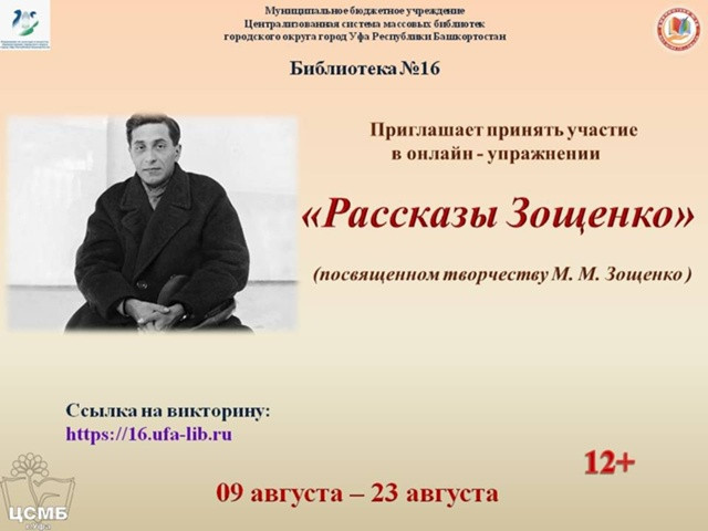 Библиотека № 16 МБУ Централизованной системы массовых библиотек ГО г. Уфа РБ проводит онлайн-упражнение «Рассказы Зощенко», посвященное творчеству М.М. Зощенко.