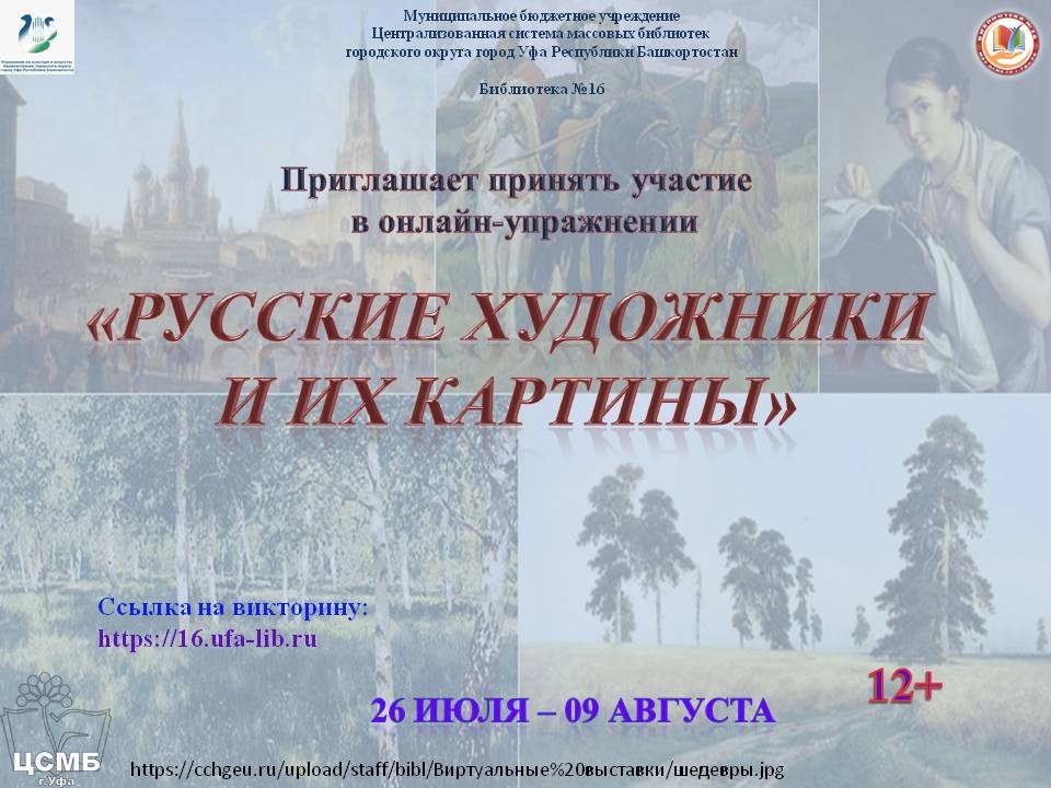 Библиотека № 16 МБУ Централизованной системы массовых библиотек ГО г. Уфа РБ проводит онлайн-упражнение «Русские художники и их картины», посвященное известным произведениям русских художников.