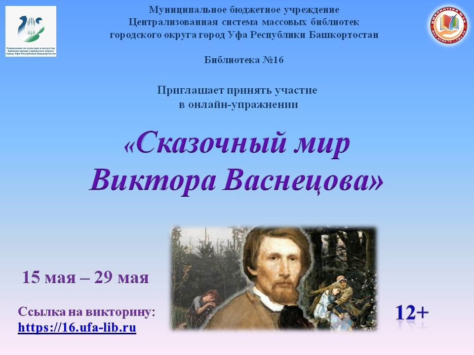Библиотека № 16 МБУ Централизованной системы массовых библиотек ГО г. Уфа РБ проводит онлайн-упражнение «Сказочный мир Виктора Васнецова».