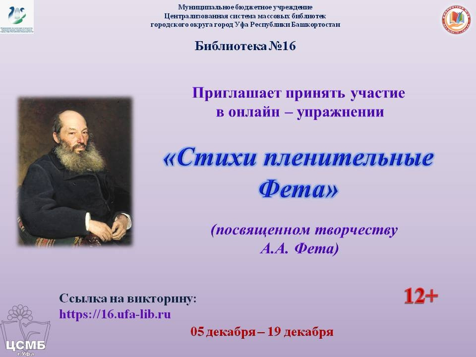 Библиотека № 16 МБУ Централизованной системы массовых библиотек ГО г. Уфа РБ проводит онлайн-упражнение «Стихи пленительные Фета», посвященное творчеству А.А. Фета.