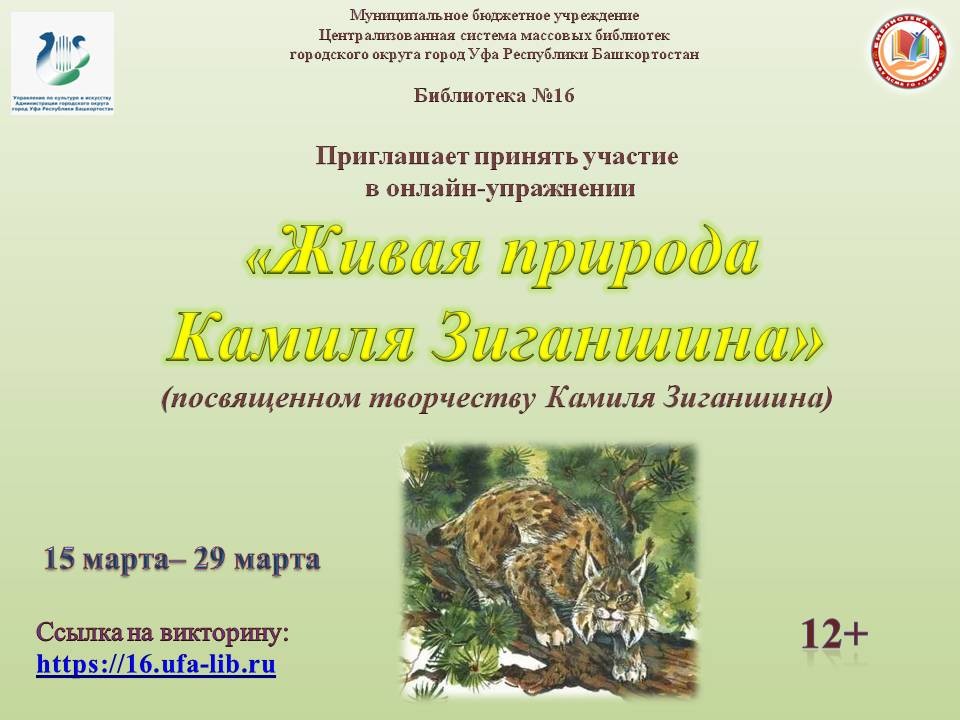Библиотека № 16 МБУ Централизованной системы массовых библиотек ГО г. Уфа РБ проводит онлайн-упражнение «Живая природа Камиля Зиганшина», посвященное творчеству Камиля Зиганшина.