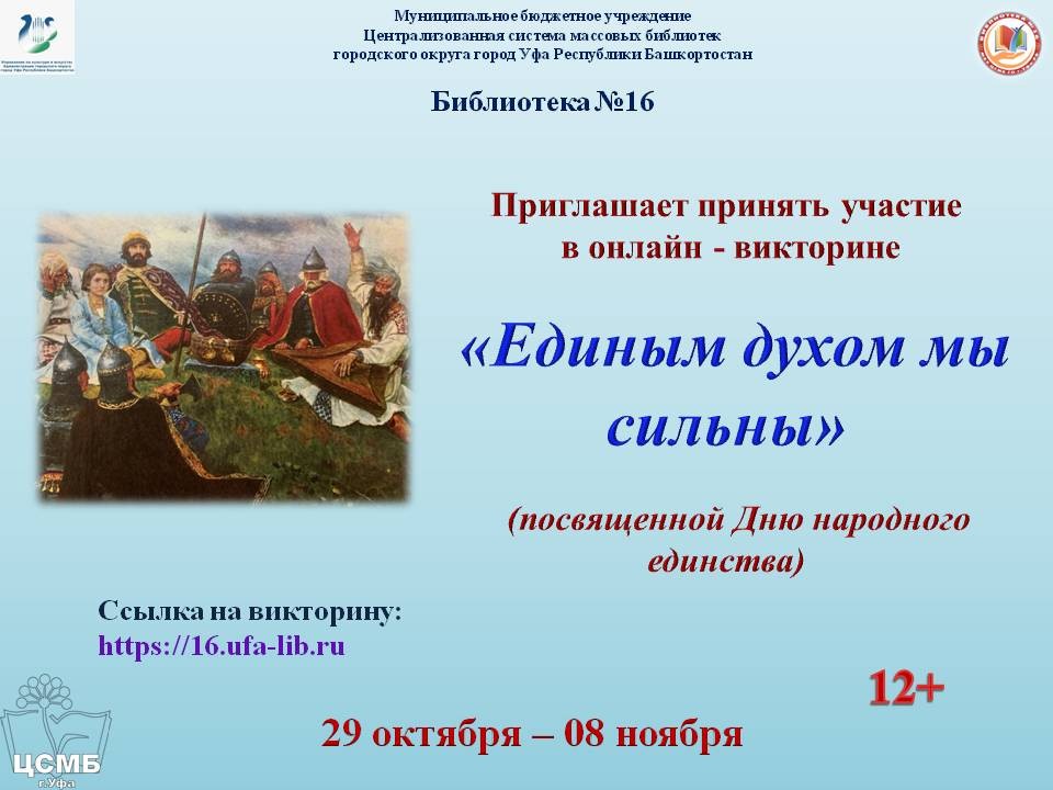 Библиотека № 16 МБУ Централизованной системы массовых библиотек ГО г. Уфа РБ проводит онлайн-викторину «Единым духом мы сильны», посвященную Дню народного единства.