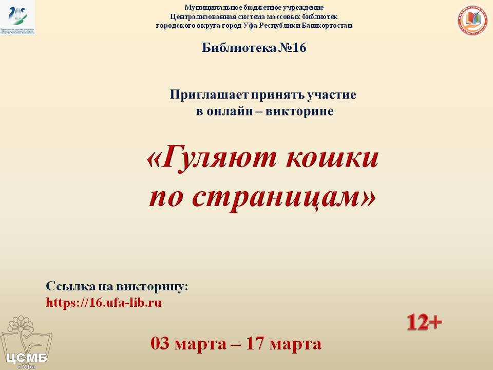 Викторина доступна на сайте библиотеки № 16 16.ufa-lib.ru/ с 03 марта по 17 марта до 13 часов по мск.